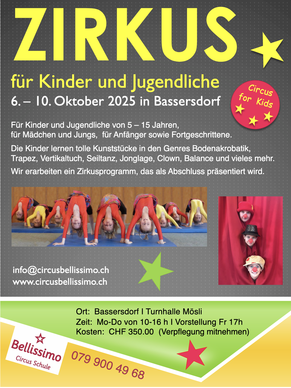 Trapez, Vertikaltuch, Seiltanz, Jonglage, Clown, Balance und vieles mehr.