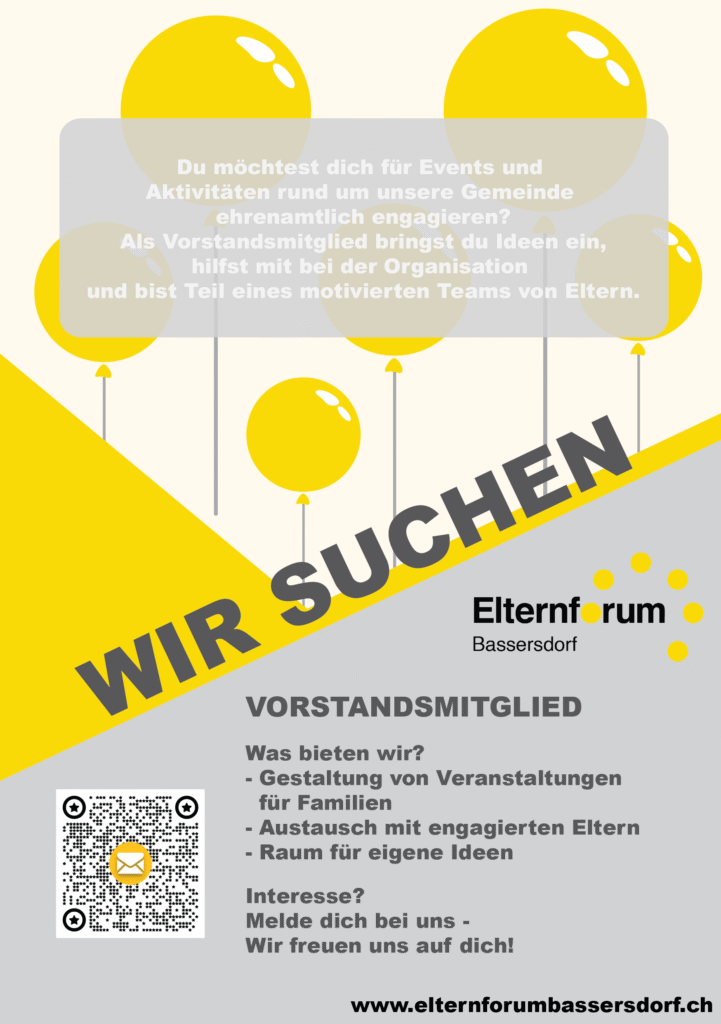 Liebe Mitglieder, das Elternforum Bassersdorf lebt von euch – von eurem Engagement und eurer Unterstützung! Deshalb bitten wir euch herzlich: Bringt euch ein, besucht unsere Generalversammlung, helft bei der Organisation unserer Veranstaltungen und sorgt so dafür, dass unser Verein auch in Zukunft lebendig und stark bleibt!